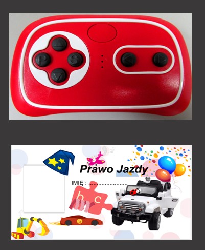 - zdalnie sterowany za pomocą pilota, jak również dziecko może jeździć samodzielnie przy użyciu kierownicy i pedału gazu