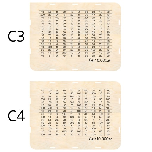 Skarbonka zabezpieczona jest pieczęcią lakową którą należy przełamać po wykreśleniu wszystkich kwot i zebraniu określonego celu. W zestawie znajduje się marker który pomoże w wykreślaniu wrzuconych do skarbonki kwot.