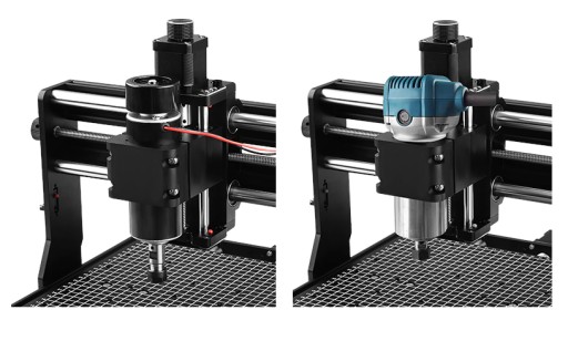 - Dwa mocowania wrzeciona w zestawie - 52mm do wrzeciona dostarczonego z frezarką oraz 65mm pozwalające na zamontowanie mocniejszego wrzeciona.