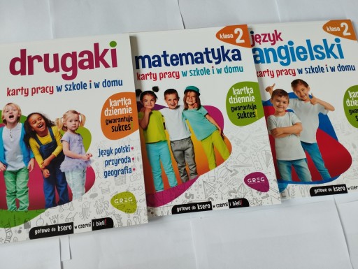 Na tej aukcji oferuję zestaw trzech książek z serii Karty pracy w szkole i w domu. W skład zestawu wchodzą tytuły: Matematyka klasa 2, Język Angielski klasa 2, Drugaki. Wydawnictwo GREG.
