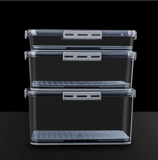 Nasze pojemniki są szczelnie zamykane dzięki czterostronnemu systemowi klamer zabezpieczonych silikonowymi uszczelkami.Posiada również korek spustowy powietrza oraz świetny system datownika dzięki czemu ustawisz czas włożenia produktów do lodówki!