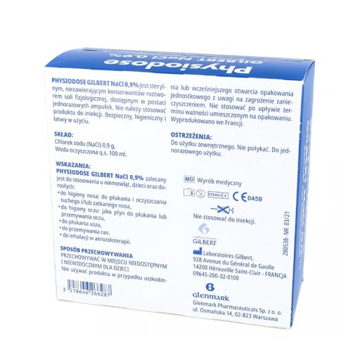 Sterylny roztwór soli fizjologicznej Glibert NaCl 0,9% w jednorazowych ampułkach 5 ml. Produkt można używać do higieny nosa, oczu, uszu oraz przemywania ran.