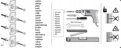 - 4 x wsporniki ścienne + 4 kołki + 4 śruby montażowe