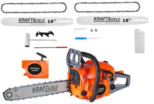 Profesjonalna piła spalinowa marki KRAFT&DELE o mocy 5,9 KM służy do obróbki drewna zarówno w przypadku prac leśnych jak i w gospodarstwie domowym.