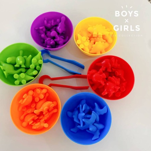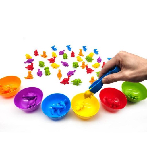 3. Następnie staramy się aby wszystkie dinozaury trafiły do odpowiednich kubeczków, gdzie kolor dinozaura jest identyczny jak kolor kubeczka.