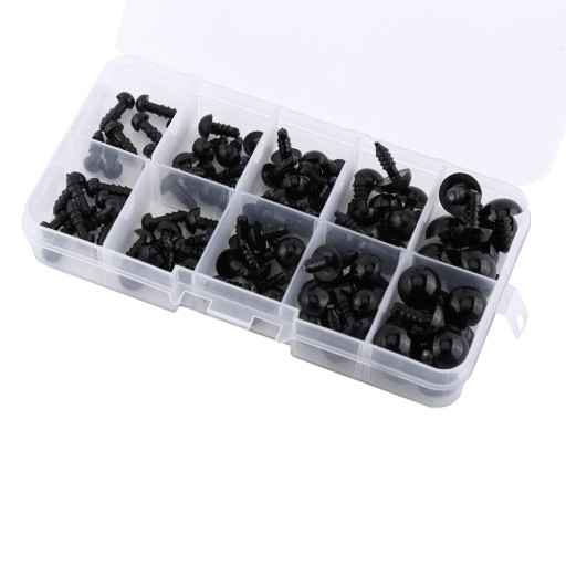 Zestaw zawiera sto czarnych oczu i sto plastikowych plecków w małym opakowaniu. Oczy zabawek wahają się od 6 mm do 12 mm, każdy otrzymuje zestaw po 20. W tym pudełku jest mnóstwo oczek do tworzenia lalek lub zabawek przez długi czas. Mogą być również używane jako dobre zastępcze oczy do starych lub uszkodzonych oczu zabawek. Plecy są ciasno dopasowane, więc nie musisz się martwić, że się odkleją.