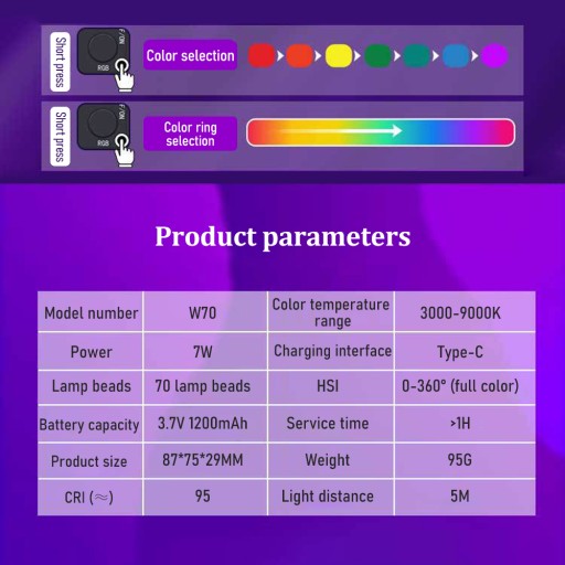 【Tryb kolorowego światła HSI】 Mini lampa fotograficzna oferuje różnorodne kolorowe efekty świetlne w trybie HSI, który obejmuje zakres nasycenia 0-100, regulowany odcień 360 ° i regulowaną jasność od 1% do 100%.