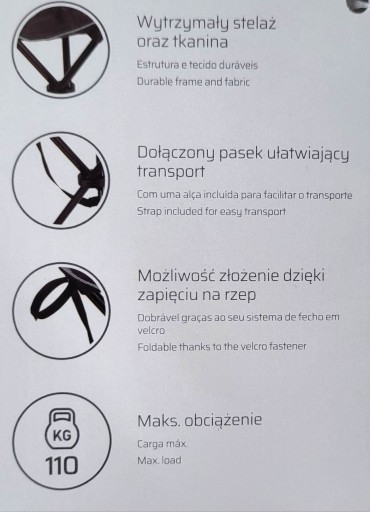 Dodatkowo, krzesełko posiada praktyczny pasek do przenoszenia złożonego krzesełka np. na ramieniu.
