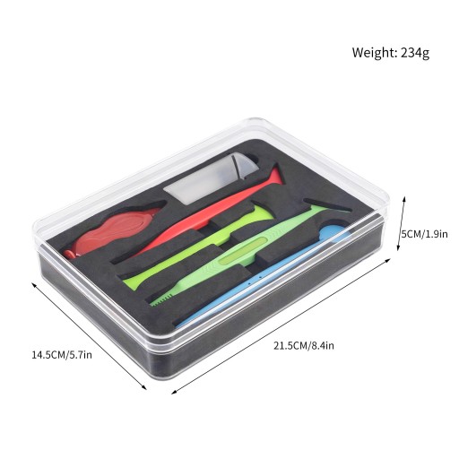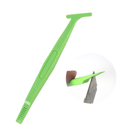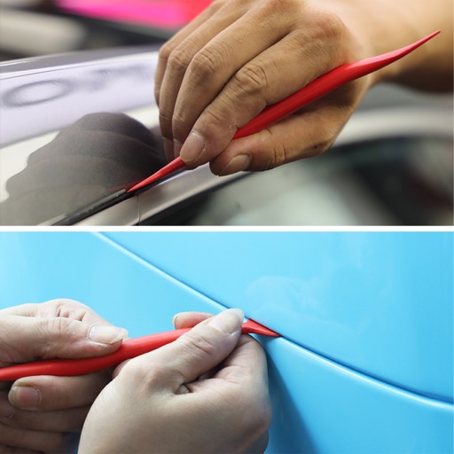 - Dwa końce robocze, jeden koniec w kształcie haczyka umożliwia zawijanie folii na krawędziach powierzchni, takich jak drzwi czy okolice reflektorów lub odciagniecie uszczelki. Drugi koniec pozwala na precyzyjne wciśnięcie folii w ciasne miejsca.