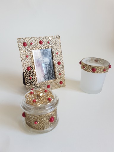 DEKORACYJNY KOMPLET NA KOMODĘ - RAMKA NA FOTOGRAFIĘ , MAŁA SZKATUŁKA I LAMPION - ŚWIECZNIK . CAŁOŚĆ WYKONANA Z METALU W KOLORZE ZŁOTYM - FILIGRAN OZDOBIONE KAMIENIEM W KOLORZE KORALA