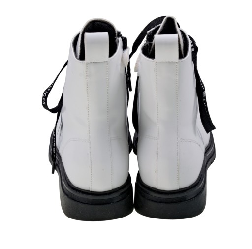 Trzewiki marki Tommy Hilfiger model T4A5-32010-0776100 w kolorze białym. Wykonane w całości ze skóry ekologicznej z połyskiem. Wnętrze wraz z wkładką obuwia to materiał tekstylny, podeszwa wysokogatunkowe tworzywo syntetyczne. Klasyczny model trzewików dopasuje się do każdej stylizacji i będzie uzupełnieniem jesiennej garderoby