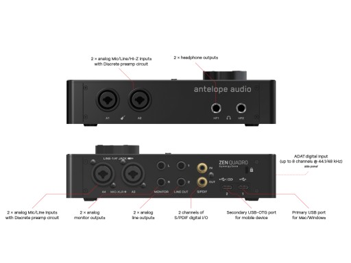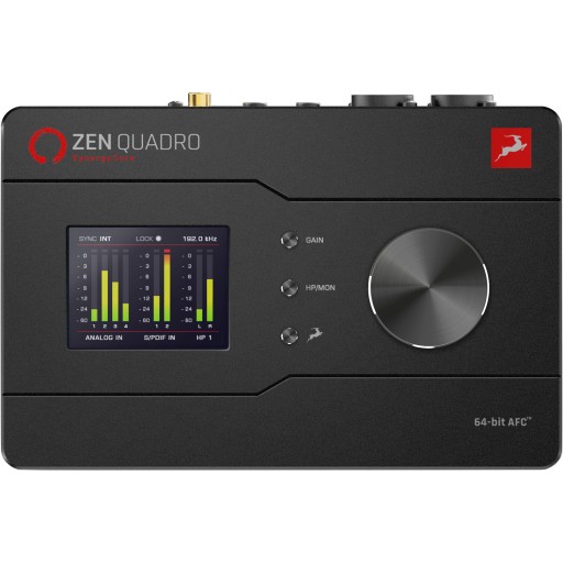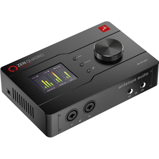 Antelope Audio Zen Quadro Synergy Core to interfejs audio z 4 dyskretnymi przedwzmacniaczami, technologią synchronizacji AFC 64-bitową, podwójnym portem USB-C, trybem autonomicznym z kolorowym wyświetlaczem oraz rdzeniem Synergy z modelowaniem efektów.