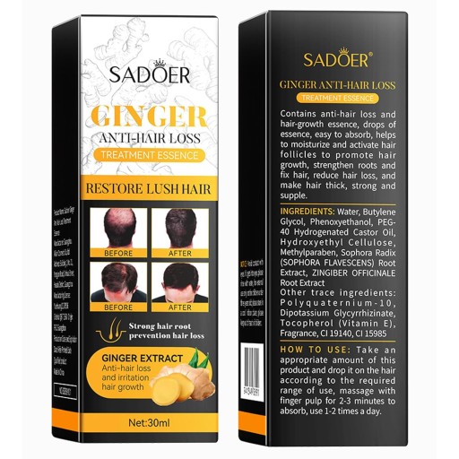 About this item Sadoer Ginger Anti-Hair Loss: Ginger hair essential oil to promote faster hair growth, Natural Plant ginger hair growth oil Making hair smooth and shiny. Sadoer Ginger Hair Growth Oil: Ginger hair care essential oil protects your scalp from drying out, shine, and controls frizz. Sadoer Ginger Anti Hair Loss Hair Growth Treatment: restore hair, ginger anti hair loss oil mild. How to use: After wetting hair, apply an ample amount of Anti-Hair Loss Shampoo for Hair Loss evenly, massage into hair for 5-8 minutes, rinse with water and use once daily. Sadoer Ginger Anti-Hair Loss serum is suitable for both men and women.