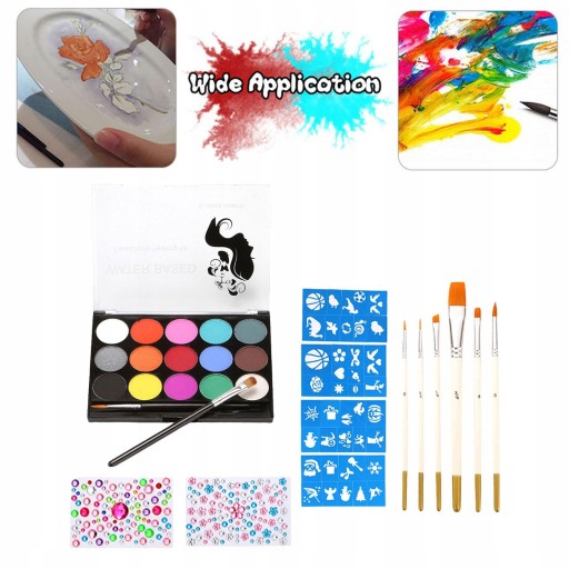 Krem do malowania ciała: jest 15 sztuk farb do twarzy na bazie wody, 6 sztuk pędzli, 4 sztuki szablonów i 2 sztuki brokatów Profesjonalna paleta, materiały do malowania twarzy