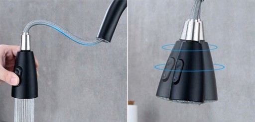 【2 ustawienia regulatora wody】 bateria kuchenna z 2 trybami regulacji (przepływ/spray), przepływ do źródła wody, silny spray do wentylatora i zasilacza spłukanie zlewu.