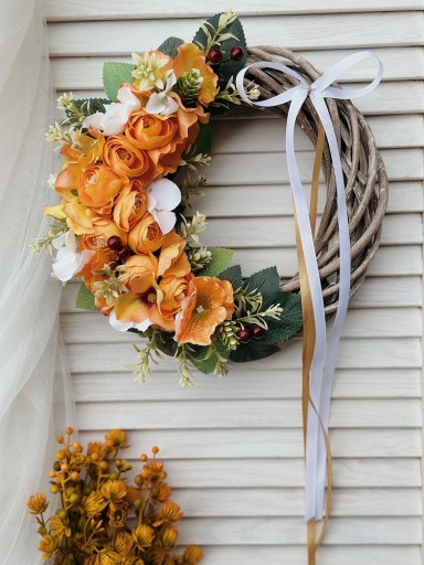 Wianek kwiatowy, ozdobiony sztucznymi kwiatami w pomarańczowych odcieniach oraz różnorodnymi dodatkami, liśćmi i kokardką.