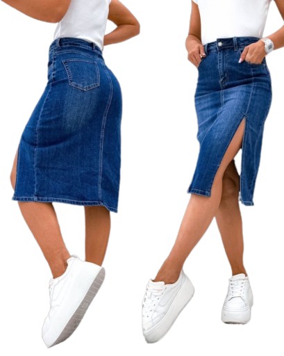 Klasyczna spódnica jeansowa z rozcieciem z przodu. Wykonana z elastycznego materiału, bardzo ładnie dopasowuje się do ciała. Spódnica jeansowa to klasyczny element garderoby, który wprowadza do stylizacji nutę casualowego uroku i wygody. Ta spódnica jest zarówno modne, jak i praktyczne rozwiązanie na wiele okazji.