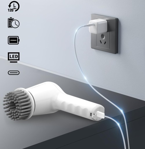 Electric Spin Cleaner jest wyposażony w najnowszy port ładowania USB-C z wbudowanym akumulatorem o pojemności 2000 mAh, który może wytrzymać 120 minut po zaledwie 2 godzinach ładowania. Elektryczna szorowarka prysznicowa może wyraźnie poznać pozostałą moc za pomocą wyświetlacza LED, co jest bardzo wygodne w użyciu.