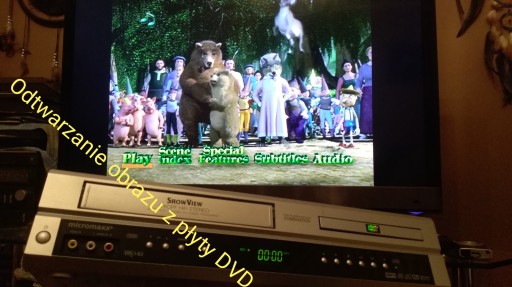 Maszyna technicznie w bardzo dobrym stanie, na ostatnich zdjęciach widać jaki generuje świetny obraz i soczyste kolory z kaset VHS a odtwarzacz DVD również działa ideał.