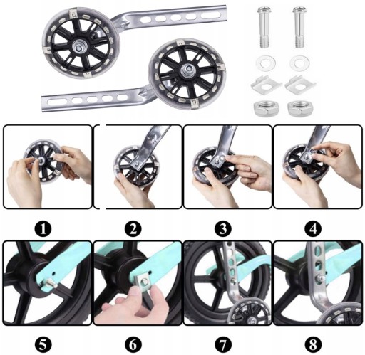- Łatwy w instalacji dzięki dołączonym akcesoriom montażowym, po prostu przymocuj koła treningowe za pomocą wsporników do roweru i pozwól dziecku bezpiecznie jeździć na rowerze.
