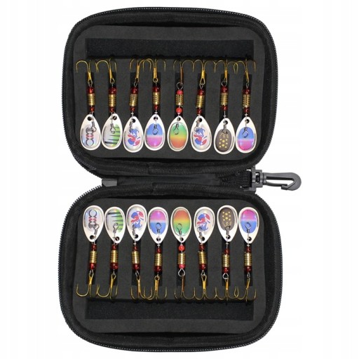 - 16-częściowe ważone metalowe przynęty wahadłowe ułatwiające rzucanie.