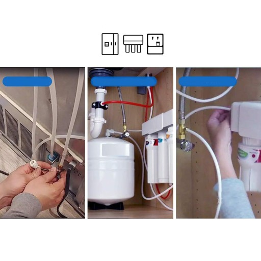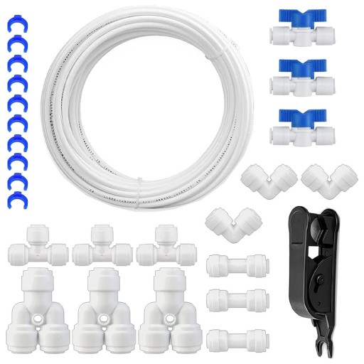 Dostarcza wodę do lodówek, systemów filtrów odwróconej osmozy (RO), lodów, chłodziarek i dozowników wody, nawilżaczy i innych. Za pomocą tego zestawu można podłączyć lodówki side by side, systemy odwróconej osmozy, akwaria i różne filtry wody do źródła wody za pomocą węża 6,35 mm (1/4").