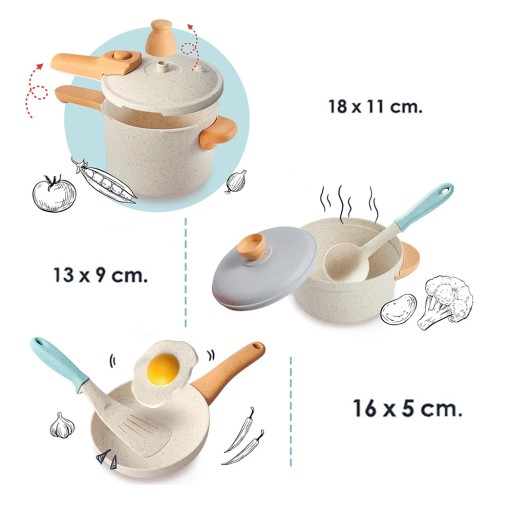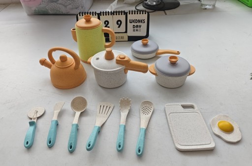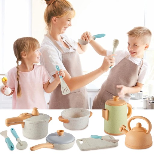 akcesoria kuchenne dla dzieci, w tym garnki i patelnie, garnki, czajniki, przybory kuchenne, deski do pałeczek i jajka sadzone.