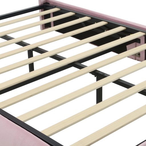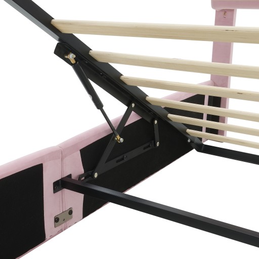 - Miękkie legowisko Rabbit Ears wykonane jest z różowego aksamitu i zachwyca wyjątkowym designem i praktyczną funkcjonalnością. Dwa okrągłe stołki do przechowywania z rysunkami można umieścić na końcu łóżka lub w dowolnym miejscu. Samo łóżko ma kształt uszu króliczka, a jedno z nich jest wyposażone w diodę LED o regulowanej jasności, która emituje ciepłą, żółtą poświatę. Ma solidny metalowy kil i solidne drewniane listwy, a także dźwignie hydrauliczne, które otwierają dużą przestrzeń do przechowywania pod łóżkiem. Jego wymiary to 140x200 cm, dzięki czemu jest wygodny i zapewnia dodatkową przestrzeń do przechowywania.