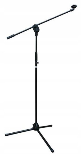 Statyw mikrofonowy z wysięgnikiem, uchwytem klamerkowym na mikrofon i pokrowcem.