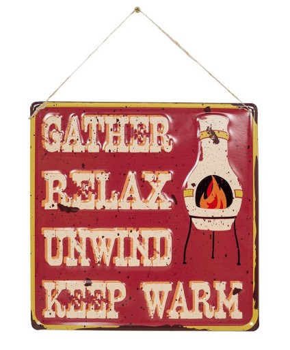 Tłoczona tabliczka metalowa z napisem "Gather Relax", promująca wspólne spędzanie czasu na tarasie lub w ogrodzie przy cieple ognia z ogniska, paleniska ogrodowego czy kominka.