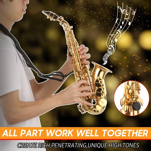 Saksofon sopranowy, lakierowany na złoto, elegancki, ładny, wykonany z mosiądzu, o chropowatej strukturze, kunsztownie wykonany: gładka linia smyczka w kształcie litery U zapewnia dobrą szczelność; skórzane nakładki i starannie wykonane klawisze dobrze ze sobą współpracują, pozwalając na łatwiejszą i lepszą grę. Ten instrument dęty wytwarza unikalne wysokie tony, zalecane dla studentów lub doświadczonych muzyków, do wykorzystania na scenie, pokazach ulicznych, występach solowych itp.