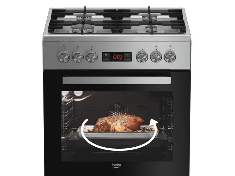 - Górne i dolne ogrzewanie z wentylatorem – gorące powietrze przepływa równomiernie w całym piekarniku