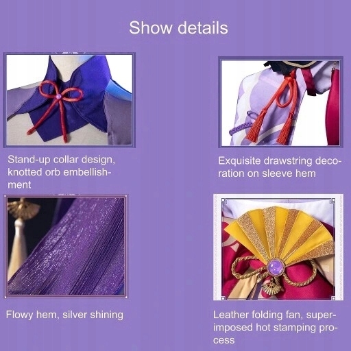 Cechy: Znakomite wykonanie. Wykwintne krawiectwo stroju podkreśla sylwetkę. Wyraźne drukowane wzory, bez blaknięcia i barwienia. Ten kostium cosplay można prać tylko ręcznie.