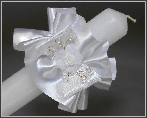 Komplet komunijny: Torebka wykonana z satyny ślubnej pierwszego gatunku. Ozdobioną plecioną biało-złotą rączką i kokardką z kryształkami takimi samymi jak przy wianku oraz okapnik z taśmy satynowej premium. Na osobnych aukcjach można również dopasować rękawiczki komunijne oraz wianek