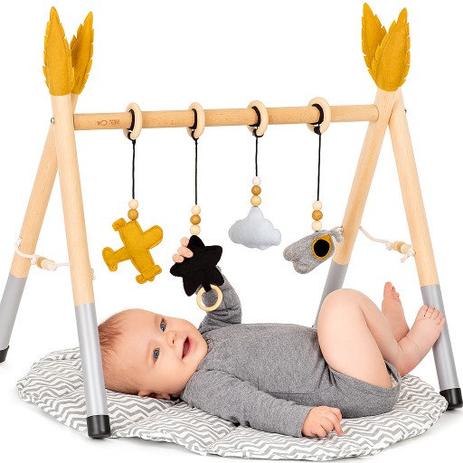 Nasz drewniany stojak edukacyjny Happy Hippo Baby GYM to idealny kompan dla Twojego maluszka od pierwszego miesiąca życia. Zaprojektowany z myślą o bezpieczeństwie i rozwoju, stojak stymuluje zmysły, zachęca do ruchu i zapewnia godziny zabawy. Dzięki eleganckiej kolorystyce i dbałości o szczegóły, staje się pięknym elementem dziecięcego pokoju.