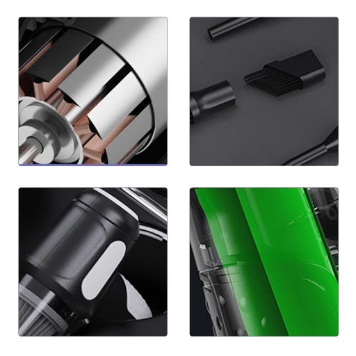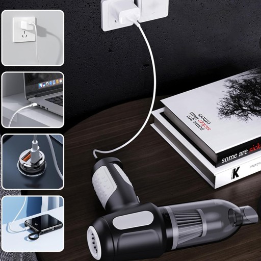 - Mini odkurzacz bezprzewodowy z różnymi końcówkami i końcówkami szczotkowymi do usuwania kurzu.