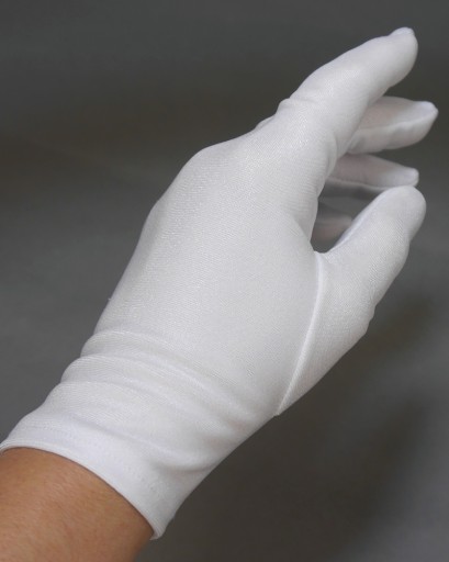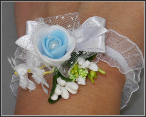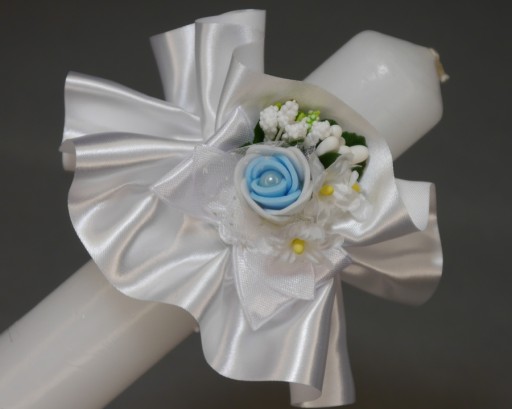 Komplet komunijny: Ozdoba na rękę, rękawiczki pięciopalczaste, torebka komunijna w kształcie woreczka z satyny ślubnej pierwszego gatunku. Torebka posiada wkładkę pomagająca w zachowaniu jej kształtu nawet po obciążeniu. Woreczek został ozdobiony stroikiem z kwiatków sztucznych w tym piankową różyczkę z niebieskim środkiem i perełką oraz satynową kokardką z biały serduszkiem. Na pozostałych aukcjach można dokupić każdy produkt osobno lub dokupić okapnik na świecę komunijną pasującą do kompletu.