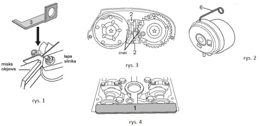 Montaż należy przeprowadzić w odwrotnej kolejności. Po założeniu koła pasowego wału korbowego zdemontować wszystkie blokady, wykonać dwa pełne obroty wałem korbowym i sprawdzić czy wszystkie znaki są w prawidłowych miejscach.