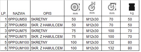 W skład kompletu wchodzą dwa zestawy mocowane na trzpień M12x30 o kodzie 6PPGUM50 (w tabeli pod pozycją nr 1) i dwa zestawy mocowane na trzpień M12x30 z hamulcem o kodzie 7PPGUM50 (w tabeli pod pozycją nr 2).