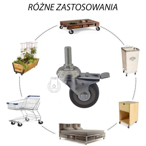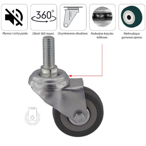 - KOŁO składa się z polipropylenowej piasty oraz z niebrudzącej gumowej opony, posiada łożysko ślizgowe. Kółka mają wytrzymałość po 50 kg na kółko. Wolno się zużywają, są odporne na uszkodzenie, amortyzują uderzenia i wibracje. Obracają się o 360 stopni ułatwiając manewrowanie meblami czy wózkiem. Gładko obracają się po twardych i gładkich powierzchniach jak beton przy bardzo małym tarciu.