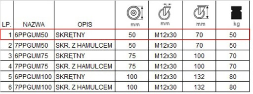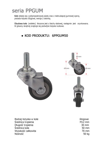 - OBUDOWY wykonane są blachy stalowej o dużej wytrzymałości. Trzpień ma wymiar M12X30, kółka mają średnicę 50 mm. Wysokość całkowita wynosi 69 mm.