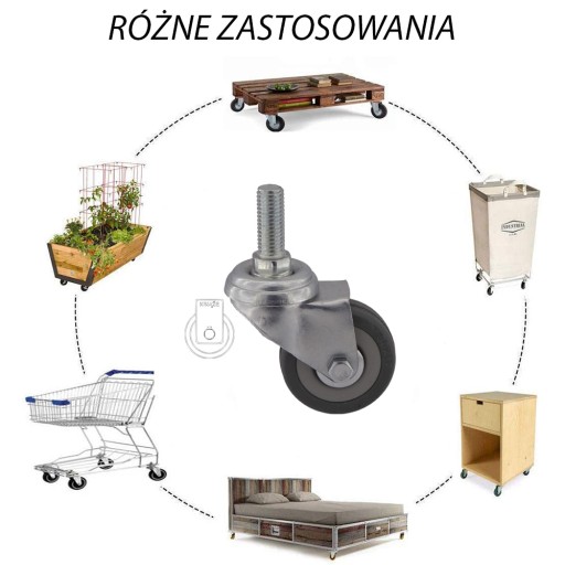 - KOŁO składa się z polipropylenowej piasty oraz z niebrudzącej gumowej opony, posiada łożysko ślizgowe. Kółka mają wytrzymałość po 50 kg na kółko. Wolno się zużywają, są odporne na uszkodzenie, amortyzują uderzenia i wibracje. Obracają się o 360 stopni ułatwiając manewrowanie meblami czy wózkiem. Gładko obracają się po twardych i gładkich powierzchniach jak beton przy bardzo małym tarciu.