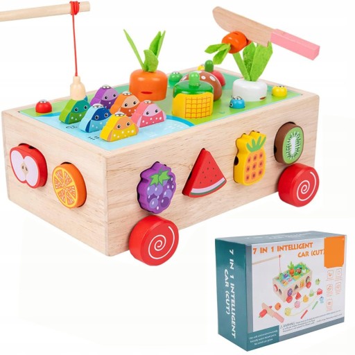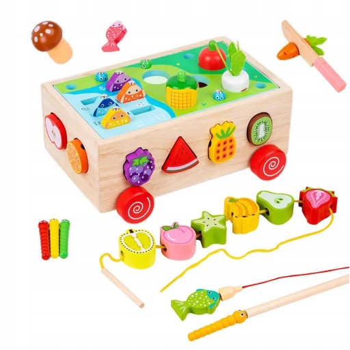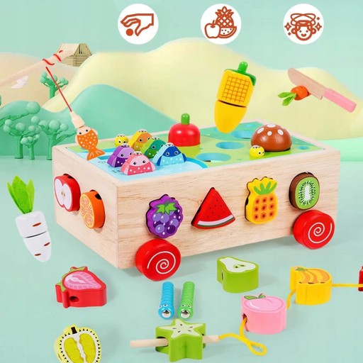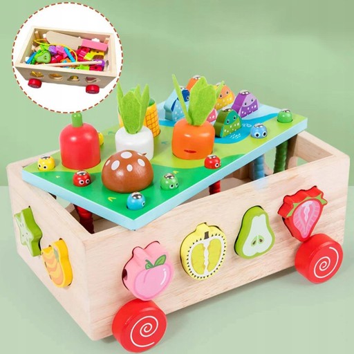 - Zabawka 7 w 1: sianie warzyw, krojenie owoców, łowienie ryb, łapanie owadów, łączenie w pary, nawlekanie, przeciąganie.