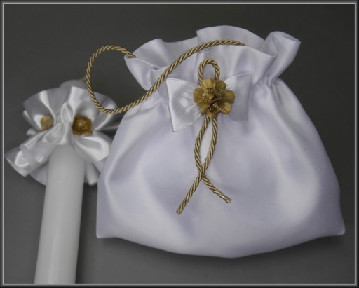 Torebka komunijna wykonana z satyny atłasowej. Ozdobiona sznureczkiem i kwiatkami w kolorze antycznego złota. Na pozostałych aukcjach produkt ten można kupić w zestawie z okapnikiem na świecę.