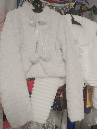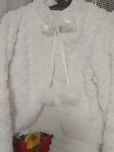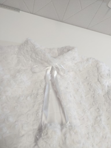 Wykonane z białego polaru MINKI bardzo milutkiego i puszystego w dotyku . Polar we wzór wytłaczanych różyczek .Wiązane na satynowe wstążeczki zakończone pomponami. Całość wykończona podszewką.
