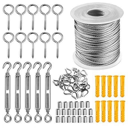 Pakiet w zestawie: Drut stalowy 30 m/98 stóp, 4 * Śruby rzymskie, 6 * Naparstek z liny stalowej, 6 * Hak oczkowy, 8 * Zacisk do liny stalowej, 4 * Pasek oczkowy ze stali nierdzewnej, 24 * Śruby, 6 * Zacisk sprężynowy, 24 * Rozszerzenie z tworzywa sztucznego tuba, 1 * schowek