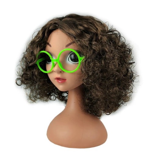 Zestaw zawiera również brązową perukę oraz zielone oprawki. Włosy są kręcone, błyszczące oraz miękkie w dotyku. Peruka posiada elastyczną siateczkę, dzięki niej można ukryć naturalny kolor włosów.