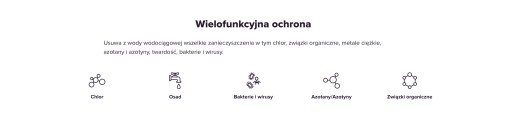 Skutecznie usuwa z wody wszelkie zanieczyszczenia w tym alergeny, takie jak np: chlor, pyłki, antybiotyki. Chroni przed zanieczyszczeniami, pochodzącymi z zakładów przemysłowych i rolniczych: fenolami, azotanami, pestycydami. Skutecznie chroni nawet w przypadku ewentualnej awarii sieci wodociągowej.