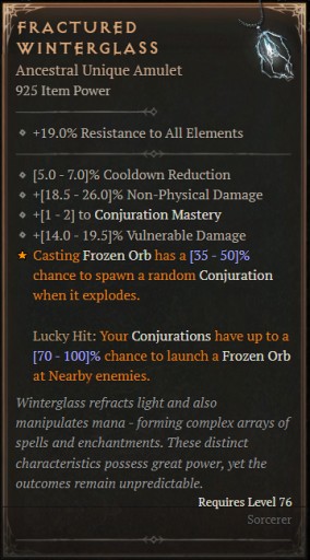 Diablo 4 IV Sezon 6 - Uniqe przedmiot FRACTURED WINTERGLASS 800 mocy