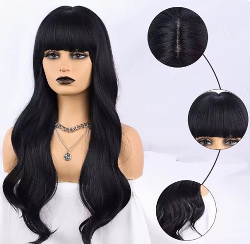 ПАРИК ЖЕНСКИЙ ДЛИННАЯ ЧЕРНАЯ ВОЛНА ИСКУССТВЕННЫЕ СИНТЕТИЧЕСКИЕ ВОЛОСЫ 65 СМ С ЧЕЛКОЙ
